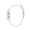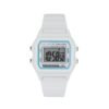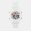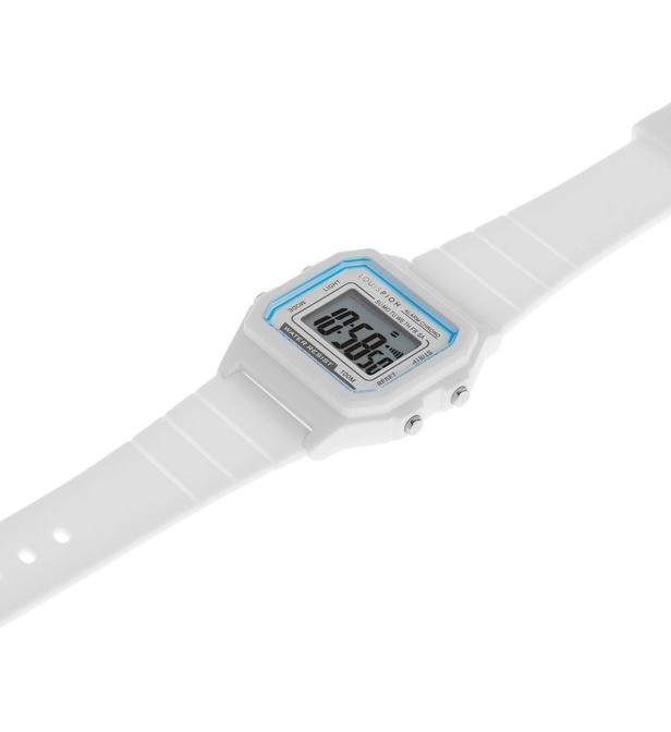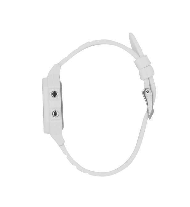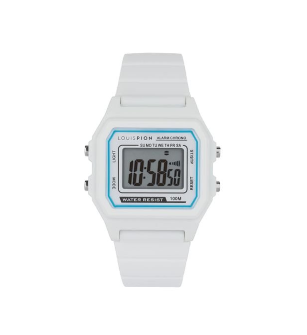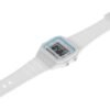 This multi-function CAMILLE watch consists of a 44mm rectangular plastic case, a digital dial with white contours and a white silicone strap.