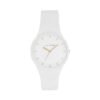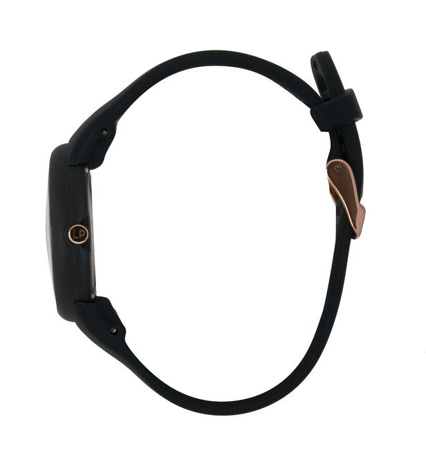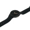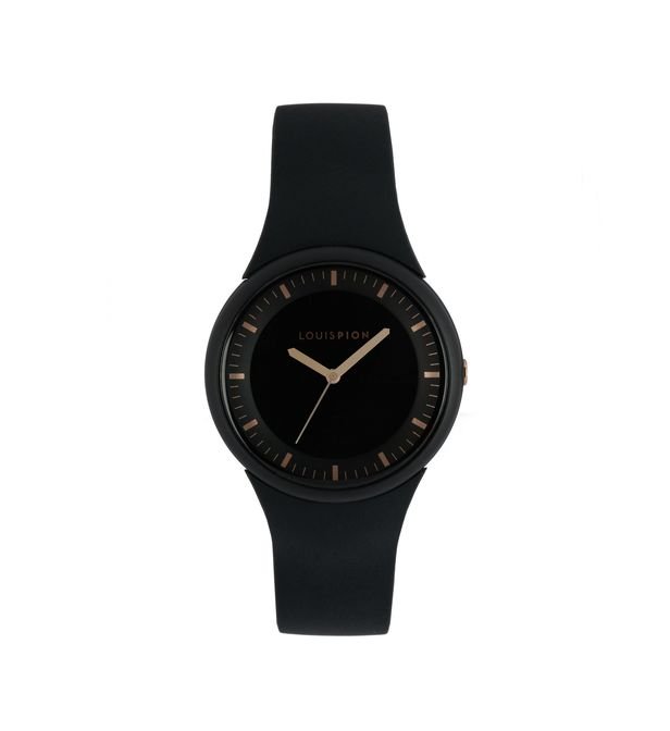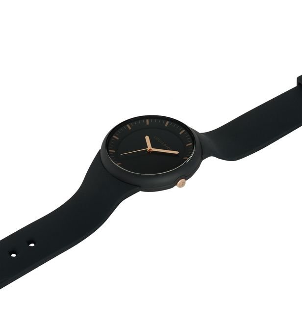 This SUZY watch consists of a 38mm round case in black plastic, a black dial and a black silicone strap.