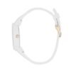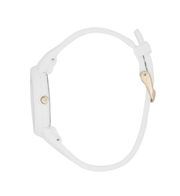This SUZY watch consists of a 38mm round case in white plastic, a white dial and a white silicone strap.